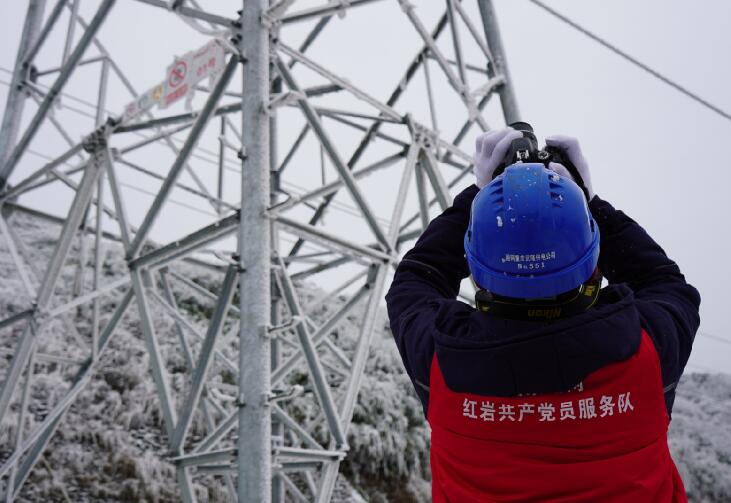 中國電力網(wǎng)訊 “110千伏四黎線今日最大覆冰厚度7.9毫米,目前風速3.5米每秒,溫度零下4度……”“小心一點,要走兩邊有草叢的地方,中間的道路結(jié)冰了,容易滑倒。”1月9日,國網(wǎng)重慶武隆供電公司輸電運維檢修班成員吳鼎、趙樓等人來到武隆區(qū)和順鎮(zhèn)四眼坪鄉(xiāng)對覆冰線路開展特殊巡視。在白雪皚皚的四眼坪,國家電網(wǎng)紅巖共產(chǎn)黨員服務(wù)隊隊服的顏色成了冰雪世界里最靚麗的一抹紅,他們手拿著無人機、砍刀、繩索、望遠鏡、風速儀等設(shè)備再一次踏入他們熟悉的“冰雪戰(zhàn)場”。