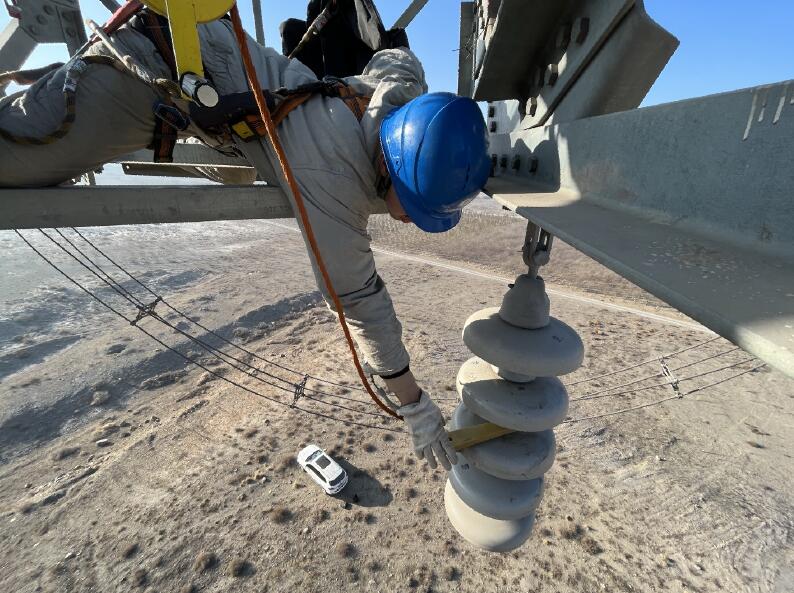 該處精心組織,提前對污染物較多的工業(yè)園區(qū)、礦場、發(fā)電廠等地進(jìn)行實(shí)地勘察,結(jié)合污區(qū)分布圖選定取樣點(diǎn)位置,制定2022年鹽密測試計(jì)劃。鹽密取樣工作對作業(yè)人員的技術(shù)以及作業(yè)環(huán)境要求極為嚴(yán)格,此次取樣工作采取地電位作業(yè)方式,作業(yè)人員在鐵塔上既要與周圍帶電體保持足夠的安全距離,還要對取樣絕緣子進(jìn)行精細(xì)操作,作業(yè)人員具備出色的身體素質(zhì)和心理素質(zhì),配合默契,圓滿完成工作。