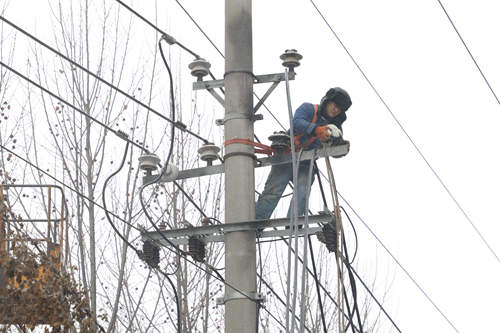 圖為搶修人員冒雪安裝新的導(dǎo)線,盡全力在最短時間內(nèi)恢復(fù)線路正常運行。(徐浩然)