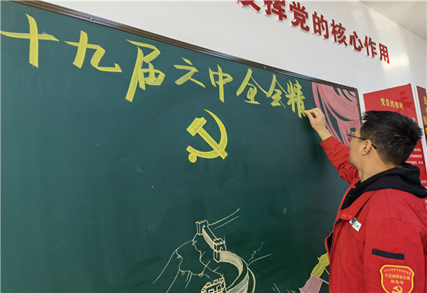 “線下”單位的青年黨員書寫黑板報,為了讓單位全體職工更全面、更及時地了解會議精神,黨員將十九屆六中全會的會議重點(diǎn)內(nèi)容經(jīng)過精心設(shè)計、編排,搬到了單位的黑板上。正在黨員活動室閱讀黑板報的積極分子說:“這個板報對全會的內(nèi)容歸納清晰、通俗易懂,這樣的學(xué)習(xí)形式讓我好像一下回歸學(xué)生時代,很受大家的歡迎。”除此之外,六五四供電公司黨支部還組織黨員結(jié)合工作崗位深入交流研討、撰寫心得體會,在學(xué)習(xí)中談?wù)J識體會、話發(fā)展變化,深化思想啟迪、促進(jìn)共同提高。