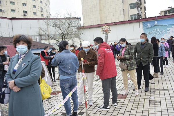26日采樣當(dāng)天,該公司工作人員分為兩隊(duì),其中一隊(duì)40余人分為4組,在中興小區(qū)開展“敲門行動”,挨家挨戶上門登記核對人員名冊,對于不會使用手機(jī)的人員則進(jìn)行一對一指導(dǎo),幫助他們快速進(jìn)行預(yù)約登記,并將不便出門人員一一登記造冊,全面掃描、不漏盲區(qū)。另一隊(duì)20余人則留在采樣現(xiàn)場,測溫、引導(dǎo)、信息登記、分發(fā)物資、環(huán)境消殺,各司其職,采樣現(xiàn)場秩序井然。對于不便出門的特殊人員,志愿者帶領(lǐng)醫(yī)護(hù)人員進(jìn)行上門采樣檢測,確保責(zé)任小區(qū)471戶應(yīng)檢盡檢、不漏一戶、不漏一人。采樣結(jié)束后,志愿者還對采樣點(diǎn)全場地進(jìn)行消殺。
