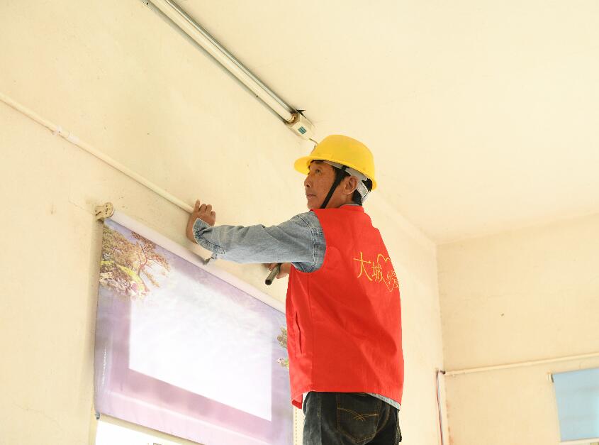 當(dāng)天,根據(jù)前期方案,志愿者把露在墻上的舊線全部拆除,鋪設(shè)新線、套進(jìn)線管,并將其牢牢地固定在墻上,運(yùn)用各種兩通、三通接頭使整個線路看起來橫平豎直,美觀大方。同時,每個出線口都裝上插座和開關(guān)底座,便于墻面粉刷完畢后進(jìn)行插座和開關(guān)安裝。