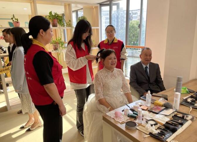當(dāng)天,該分局青年志愿者早早來到拍攝場(chǎng)地布置背景墻。不一會(huì)兒,拍攝現(xiàn)場(chǎng)擠滿了前來照相的老人?;顒?dòng)中,一旁的志愿者還會(huì)主動(dòng)上前為老人打理發(fā)型、幫忙整理服飾。“我們結(jié)婚五十多年了,從沒拍過婚紗照,今天在家門口實(shí)現(xiàn)了婚紗夢(mèng),彌補(bǔ)了我們的遺憾,真是太感謝你們了。”年邁的劉奶奶開心地對(duì)志愿者們說道。