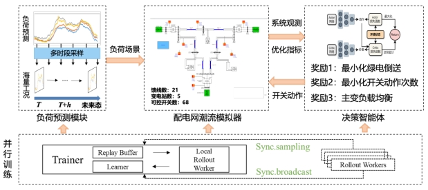 國網(wǎng)浙江省電力有限公司紹興供電公司聚焦清潔能源消納優(yōu)化控制和負(fù)載均衡目標(biāo),聯(lián)合浙江思極和阿里云等公司一起訓(xùn)練電力調(diào)度人工智能導(dǎo)航員——“調(diào)度智能體”。采用阿里云“云邊一體”數(shù)字化基礎(chǔ)設(shè)施和強(qiáng)化學(xué)習(xí)AI 核心產(chǎn)品,結(jié)合源網(wǎng)荷儲(chǔ)示范工程,從“網(wǎng)”的適應(yīng)性角度提出新能源消納通道靈活調(diào)節(jié)的思路,采用分布式近端策略優(yōu)化(PPO)為核心算法,通過預(yù)測(cè)抽樣+潮流仿真+強(qiáng)化學(xué)習(xí)訓(xùn)練迭代,生成地區(qū)主、配網(wǎng)方式調(diào)節(jié)策略,實(shí)現(xiàn)示范區(qū)域內(nèi)電網(wǎng)運(yùn)行方式面向新能源消納的自適應(yīng)調(diào)節(jié)。