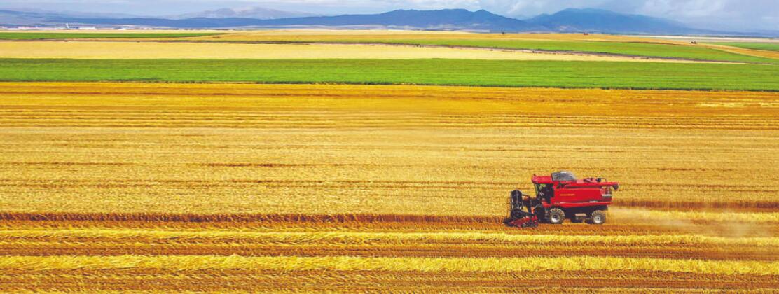 位于天山腳下的新疆昭蘇縣45萬(wàn)畝小麥喜獲豐收。李葉超 攝
