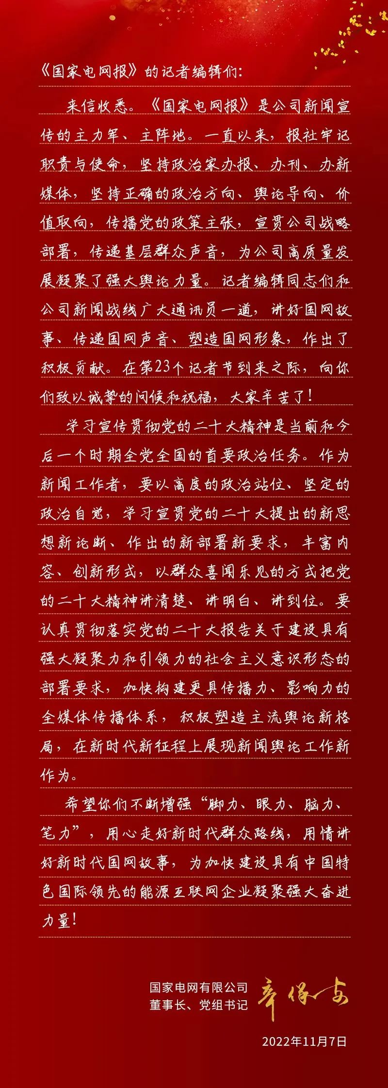 在第23個中國記者節(jié)到來之際,11月7日,國家電網(wǎng)有限公司董事長、黨組書記辛保安給《國家電網(wǎng)報》的記者編輯回信,要求認真學習宣傳貫徹黨的二十大精神,不斷增強腳力、眼力、腦力、筆力,用心走好新時代群眾路線,用情講好新時代國網(wǎng)故事,為加快建設(shè)具有中國特色國際領(lǐng)先的能源互聯(lián)網(wǎng)企業(yè)凝聚強大奮進力量。