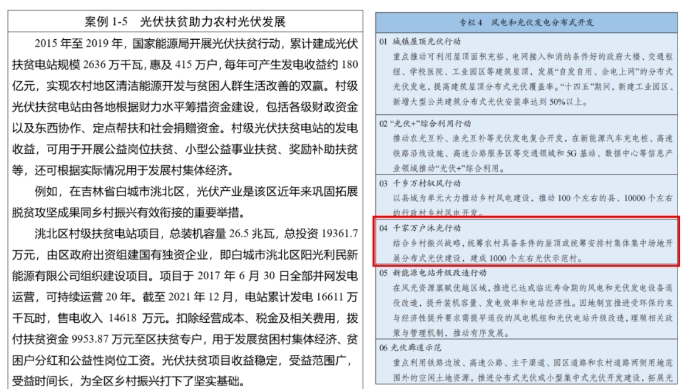 1、長期來看,鄉(xiāng)村振興是戶用光伏發(fā)展最大的機遇,分布式光伏將在農村的能源轉型中發(fā)揮重要作用!1)國家能源局“戶用光伏+鄉(xiāng)村振興”規(guī)劃2022年6月,國家發(fā)改委、國家能源局、財政部等九部委聯合下發(fā)《“十四五”可再生能源發(fā)展規(guī)劃》,特別提出:千家萬戶沐光行動!結合鄉(xiāng)村振興戰(zhàn)略,統(tǒng)籌農村具備條件的屋頂或統(tǒng)籌安排村集體集中場地開展分布式光伏建設,建成1000個左右光伏示范村。