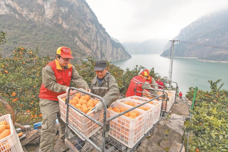 秭歸縣供電公司開(kāi)展消費(fèi)幫扶活動(dòng),組織共產(chǎn)黨員服務(wù)隊(duì)隊(duì)員幫助臍橙種植戶(hù)采摘、搬運(yùn)臍橙。梅雪飛 攝