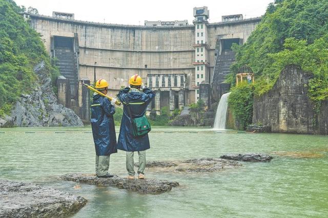 國(guó)網(wǎng)湖北恩施宣恩縣供電公司員工冒雨查看龍洞電站大壩庫(kù)區(qū)水情。