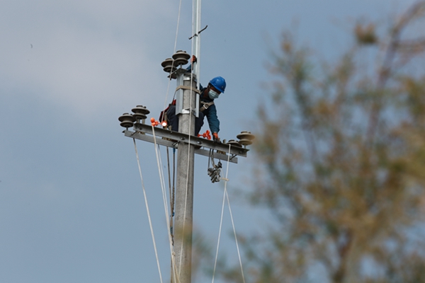 近日,在文家街道西河村,電力工作人員正在架設(shè)導(dǎo)線,將用電量超負(fù)荷的逢源線進(jìn)行割接,通過(guò)將線路延伸從而解決一部分用戶的用電低壓?jiǎn)栴}。