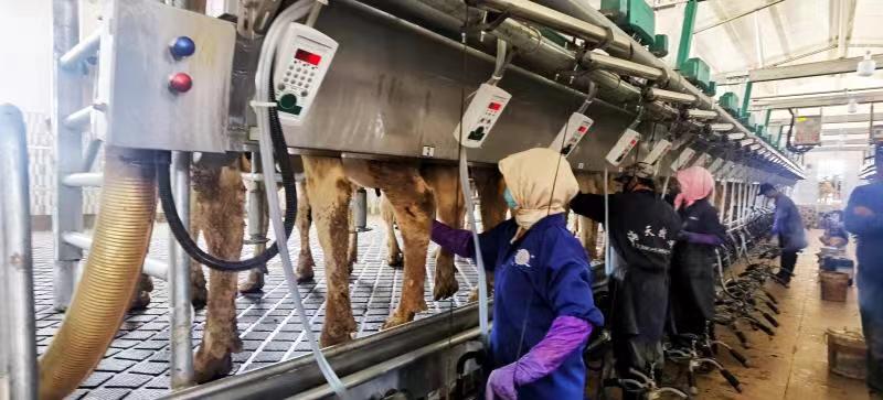 擠奶車間里,黑白相間的奶牛列隊走上緩緩轉動的擠奶轉臺,工人們依次對它們進行采奶前的乳頭清洗消毒工作,隨后,德國原裝進口轉盤擠奶機對奶牛進行自動擠奶??粗还晒蓾嵃椎娜橹鬟M容器,場長郭宏勝露出喜悅的笑容。