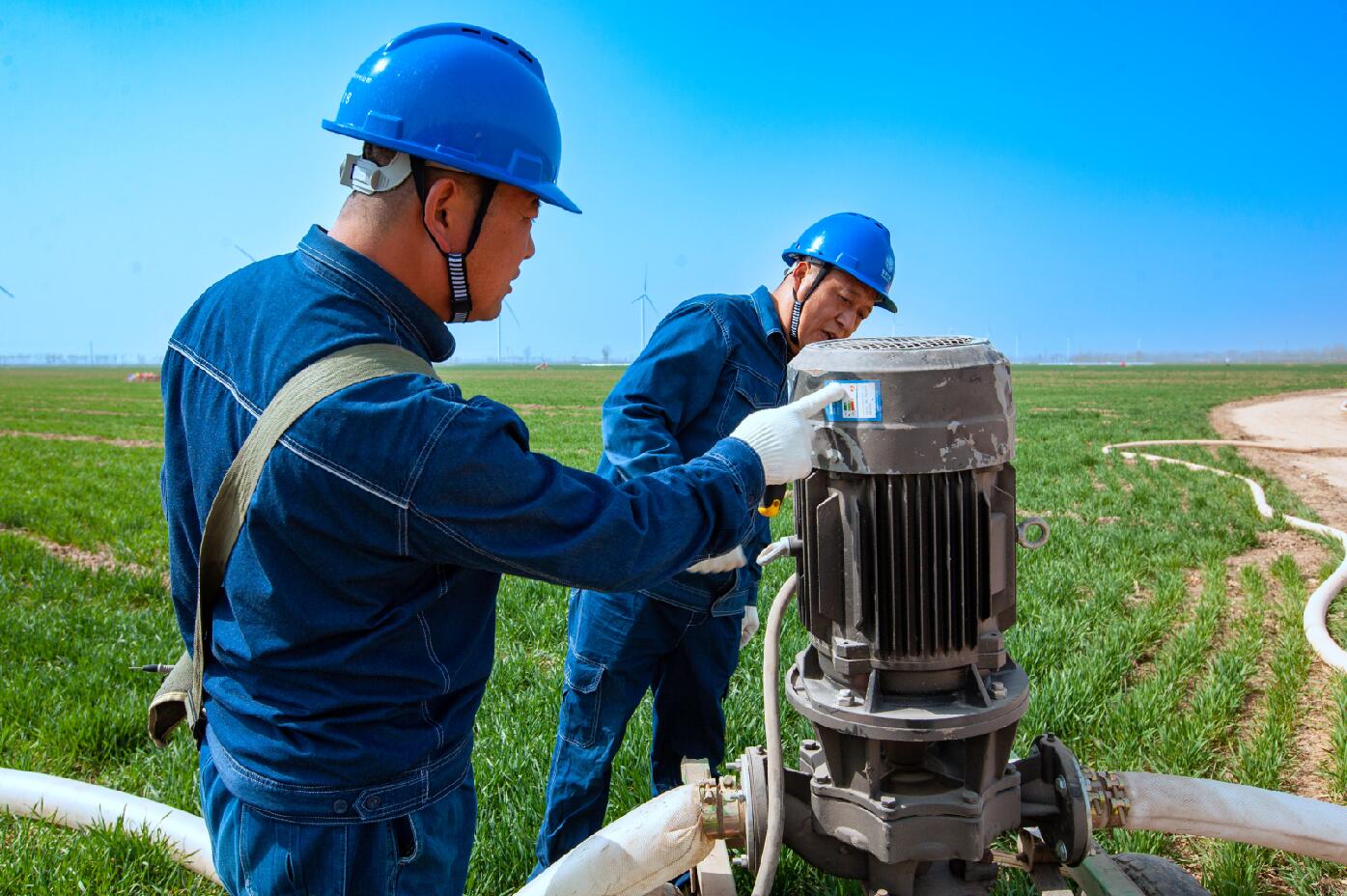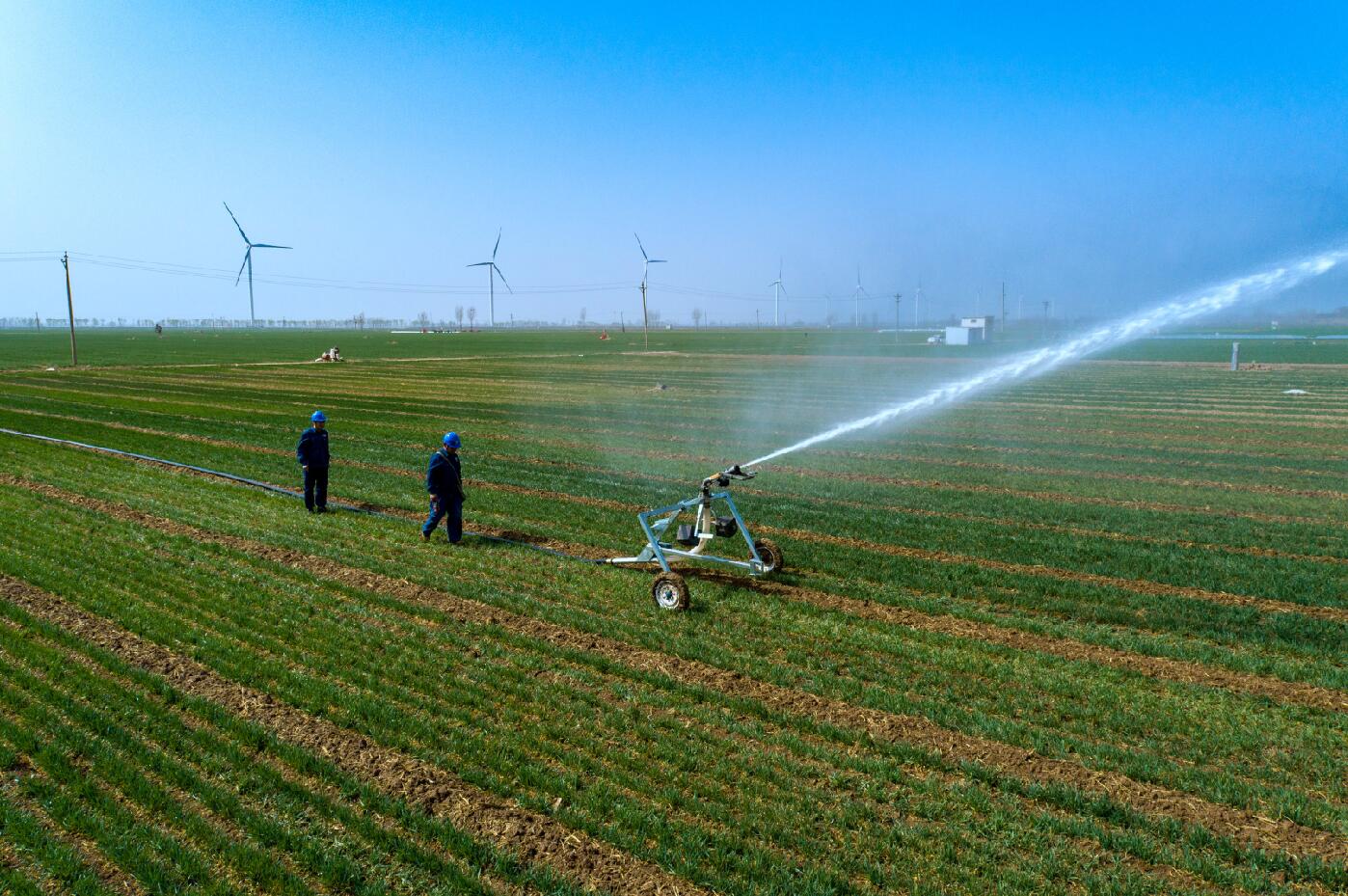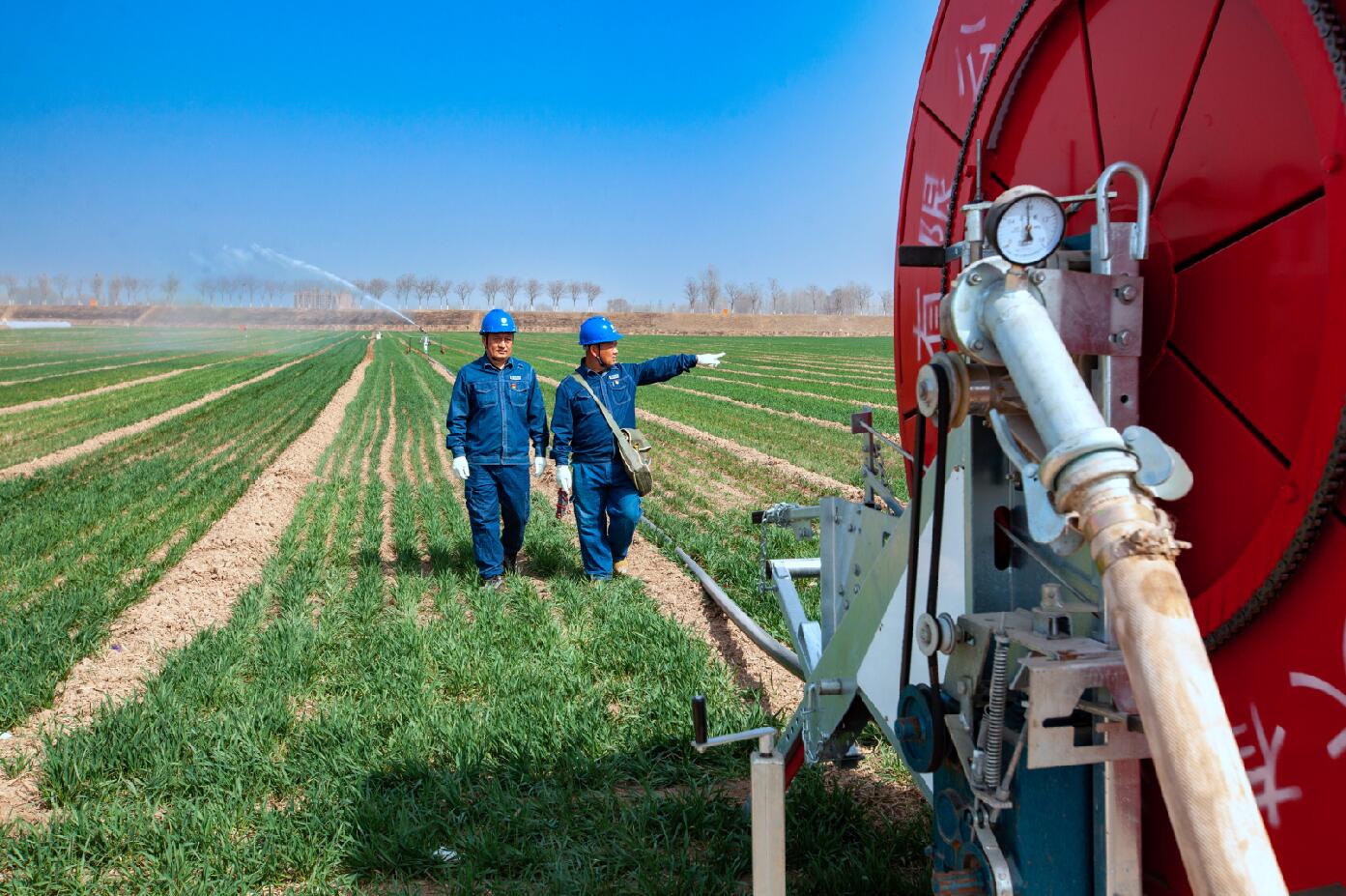 春撫萬(wàn)物,水潤(rùn)“糧倉(cāng)”。在“豫北糧倉(cāng)”滑縣麥田里,噴灌機(jī)正在努力工作,源源不斷地將清水撒向青翠的麥苗,陽(yáng)光照射下水霧七彩斑斕,一副中原糧倉(cāng)春灌生產(chǎn)的絕美畫卷。在這幅畫卷中,電力工作人員正在開展春灌保供電服務(wù)。
