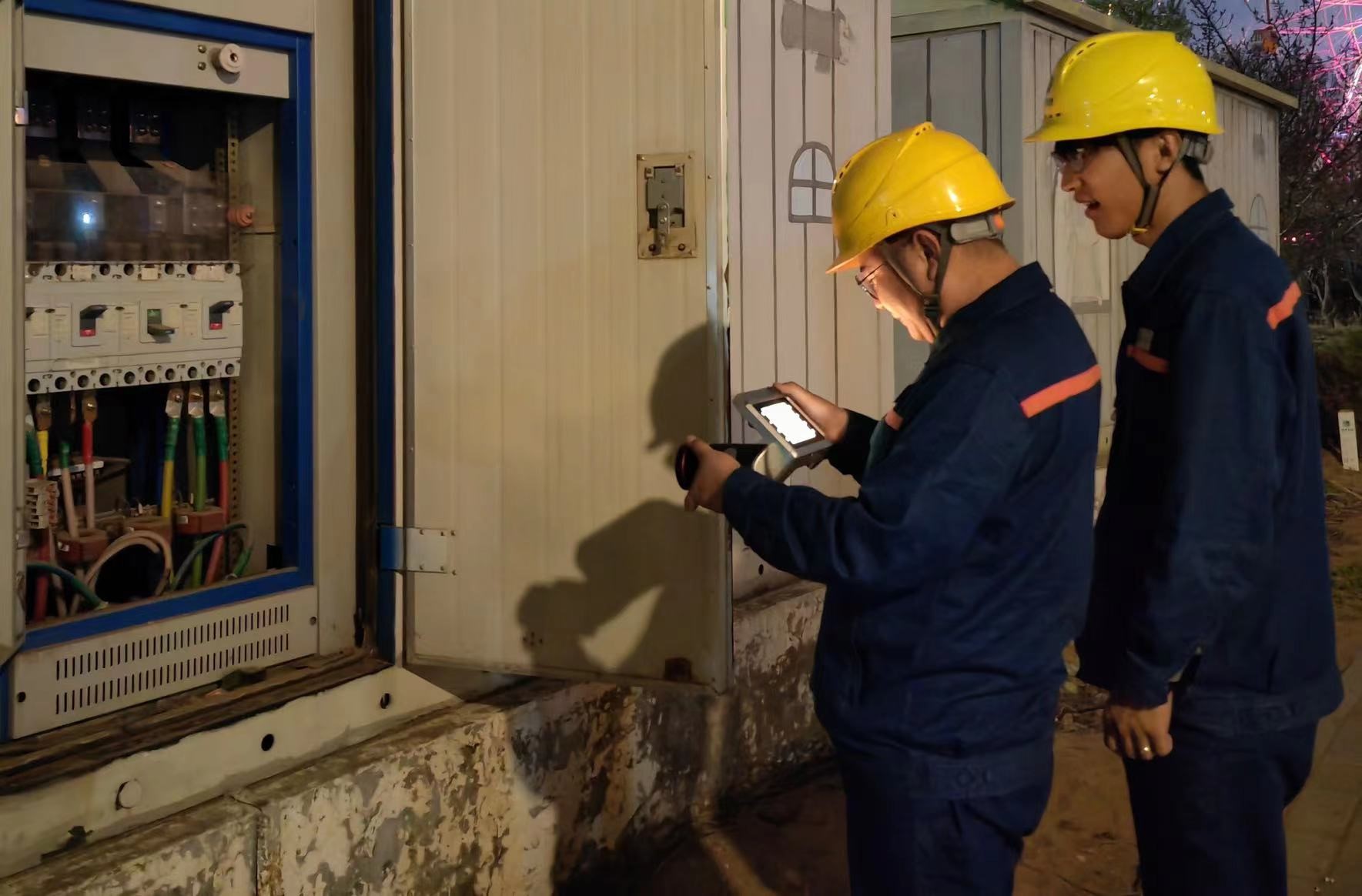 6月24日20時(shí),熙熙攘攘的人群里,郭智遠(yuǎn)和袁小龍穿行其中。今晚,他倆要完成蒙欣廣場(chǎng)和德榮2個(gè)夜市的用電安全檢查。“迎峰度夏期間工作量大,全憑兩條腿,必須要到現(xiàn)場(chǎng)實(shí)際檢查才能放心。”他們利用紅外測(cè)溫儀通過電暈、局部放電、溫升燒紅等現(xiàn)象來發(fā)現(xiàn)導(dǎo)線連接器及絕緣子存在的缺陷。對(duì)蒙欣廣場(chǎng)夜市、德榮夜市線路刀閘閘口、接頭、導(dǎo)線線夾等易發(fā)熱部位進(jìn)行全方位檢查,及時(shí)掌握設(shè)備運(yùn)行狀態(tài),避免設(shè)備出現(xiàn)故障。結(jié)束了夜市的用電安全檢查,收拾好工器具,已是22:20,但汗流浹背的兩個(gè)人并沒有回程,他們還要前往體育館的10千伏線路開展夜巡工作。