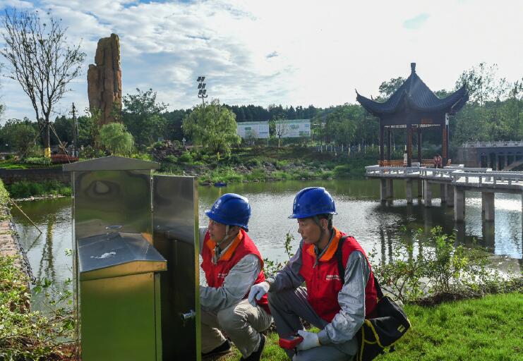 7月18日,在安徽省定遠(yuǎn)縣西卅店鎮(zhèn)“金山溪谷”旅游景點(diǎn),國網(wǎng)滁州供電公司皖美共產(chǎn)黨員服務(wù)隊(duì)員楊海榮、王培雨等對(duì)景區(qū)用電設(shè)備開展安全檢查,保障游客人身安全。