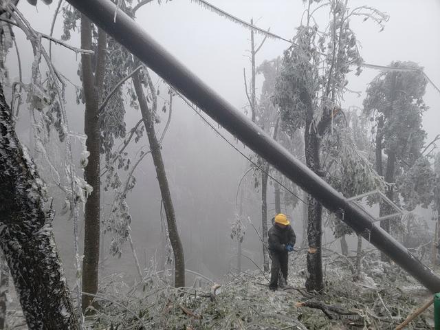 為確保景區(qū)供電需求和游客安全,該公司組織30余名黨員干部職工兵分三路,一邊緊急調集大功率發(fā)電機抬運至景區(qū),第一時間保障該線路用戶可靠供電,一邊協(xié)同云陽國家森林管理局、茶陵縣消防救援大隊緊急開展道路疏通搶險,一邊穿冰簾掃障礙,為搶修斷桿線路做準備。到處是冰碴斷枝的山林里,不斷有晶瑩剔透的冰塊從樹上掉落,搶修人員一邊用柴刀對樹枝進行清理,一邊爬冰臥雪艱難前行,清理道路,運送桿線搶修物資,在零下冰凍的高山上,分秒必爭地投入到搶修中。
