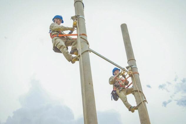 9時許,室外溫度已超過30攝氏度,隊員們在桿上桿下忙碌著。地面上,隊員邱榮軍轉(zhuǎn)動線盤將導(dǎo)線一圈圈展開進行放線后,隊員蔣院生和邱德生拖拽導(dǎo)線,肩扛手拉著將導(dǎo)線牽引到電桿下方,隊員陳秋德和王發(fā)揮則操作牽引機將導(dǎo)線牽引上桿。桿上作業(yè)的陳志強等4名隊員迅速將導(dǎo)線吊拽到電桿橫擔(dān)上,并同步使用緊線鉗收緊導(dǎo)線。