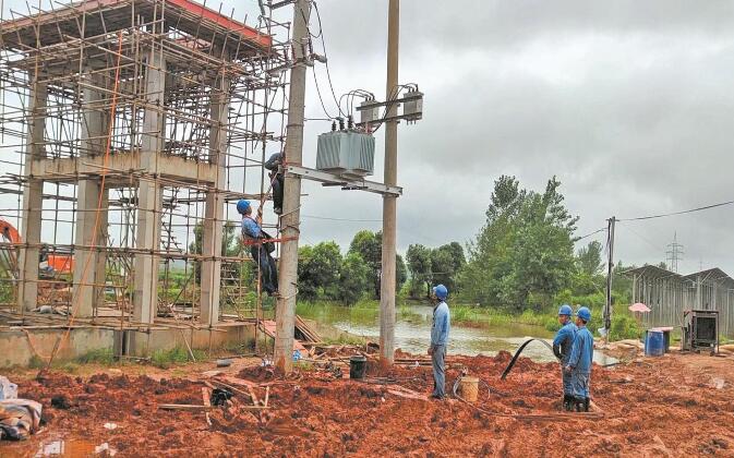 7月1日9時許,在安徽省宿松縣高嶺鄉(xiāng)高嶺村,一臺新的400千伏安專用變壓器投運送電,為白石圩泵站4臺水泵供電。有了穩(wěn)定的電力供應(yīng),水泵快速運轉(zhuǎn),排出農(nóng)田里的積水。