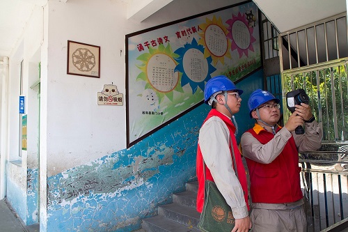 在政和縣南門小學內(nèi),共產(chǎn)黨員服務(wù)隊隊員們運用數(shù)字化紅外測溫設(shè)備對校園教室、食堂、樓道等地的線路進行一系列排查工作,并對發(fā)現(xiàn)的問題,提出合理、科學的用電整改意見,督促校方維護整改,全力為師生打造安全的用電環(huán)境。