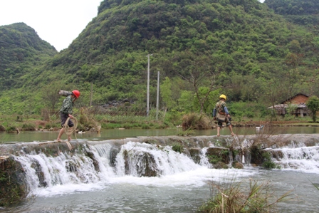 在四十工壩村外的河灘上,春水已漲過了河壩,配電班員工小周和同事們要到河對面的電桿上更換絕緣子,他們肩扛配件、手拿工具,赤足趟水過河,驚飛了河中嬉戲的鴨子,小周和同事戲說:“春江水未暖,我與鴨先知···”