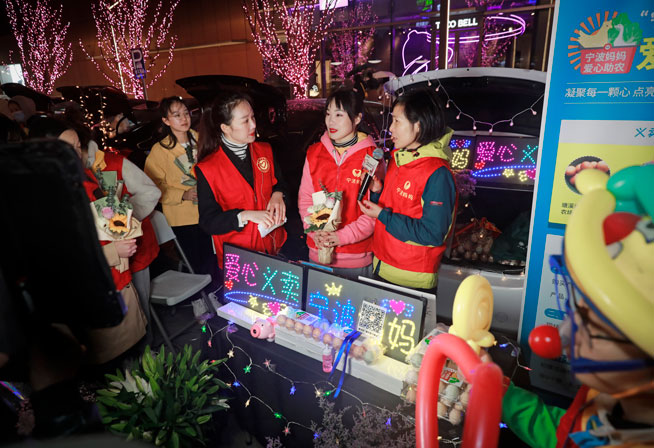 “我們下午15時就到廣場開始布置了。”張亞芬說,當(dāng)天下午她帶著丈夫、女兒和公司10多位志愿者早早地在寒風(fēng)里做起了義賣前準備工作。雞蛋、鮮花、智能感應(yīng)燈,所有的義賣商品擺放得齊齊整整。晚上18時,隨著音樂的響起,公益義賣正式開始,過往的行人來到“寧波媽媽”公益攤位前選購起來。
