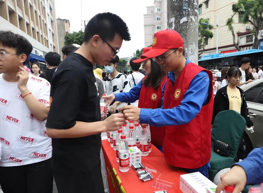 “保持平常心態(tài),加油,你們一定能考出好成績。”上午8時20分左右,隨著考生陸續(xù)進場,志愿服務點前熱鬧了起來,志愿者一邊為有需要的考生派發(fā)考試和防暑用品,一邊為他們加油鼓勁。
