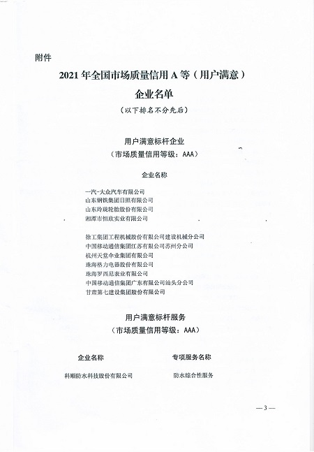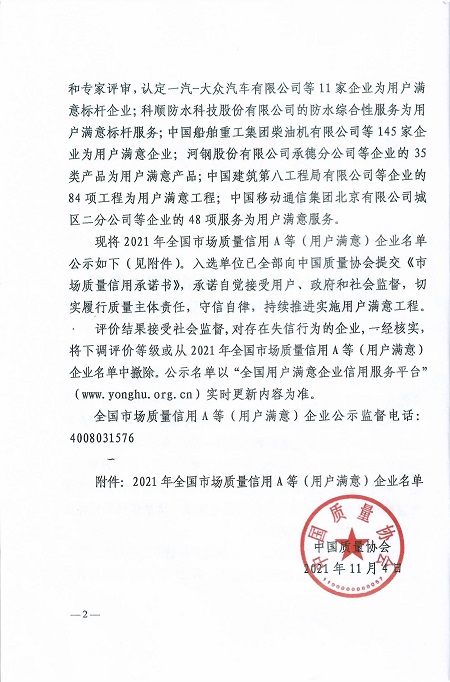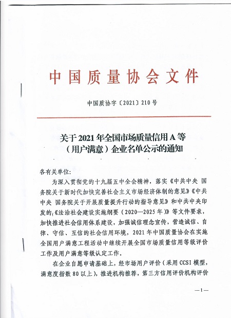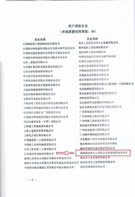 中國(guó)電力網(wǎng)訊 2021年11月18日,中國(guó)質(zhì)量協(xié)會(huì)發(fā)布了關(guān)于2021年全國(guó)市場(chǎng)質(zhì)量信用A等(用戶滿意)企業(yè)名單的通知(中國(guó)質(zhì)協(xié)字【2021】210號(hào)文)。經(jīng)過(guò)自愿申請(qǐng)、資料初審、第三方信用評(píng)價(jià)機(jī)構(gòu)評(píng)價(jià)和專(zhuān)家評(píng)審,國(guó)網(wǎng)湖南省東安縣供電分公司被評(píng)為用戶滿意企業(yè),市場(chǎng)質(zhì)量信用等級(jí)AA。