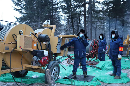 牽引機、電纜軸快速轉動,粗實的導線順著前方的鐵塔上的滑輪緩緩回收,導地線展放、張力緊線、附件安裝、導線壓接……冬季的寒風刺骨,施工人員顧不上寒冷,加緊施工。