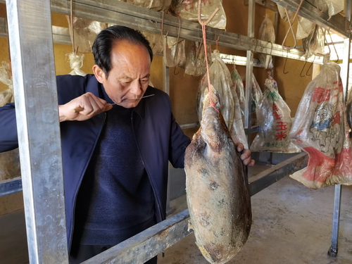 有著政府工作經(jīng)歷和脫貧攻堅(jiān)經(jīng)驗(yàn)的工作隊(duì)員李政很快就找到村內(nèi)火腿腌制技藝高超的村民陳和明,詳細(xì)了解了黎馬火腿的腌制技藝和相關(guān)流程,積極推動(dòng)陳和明火腿腌制技藝申報(bào)涼山州非遺傳承工作,黎馬火腿腌制技藝成功納入涼山州第七批非物質(zhì)文化遺產(chǎn)代表性名錄拓展項(xiàng)目。工作隊(duì)為黎馬火腿腌制梳理了標(biāo)準(zhǔn)化的腌制方案,統(tǒng)一制作標(biāo)準(zhǔn),提升黎馬火腿品質(zhì)穩(wěn)定性的同時(shí),做好火腿的質(zhì)量保障。雖然統(tǒng)一了腌制技藝,但火腿制作散做散管仍不利于黎馬火腿的品質(zhì)保障,工作隊(duì)多方爭取資源支持建設(shè)起火腿腌制定點(diǎn)作坊,進(jìn)一步為黎馬火腿的生產(chǎn)創(chuàng)造衛(wèi)生、規(guī)范化的制作環(huán)境。