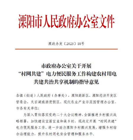 近日,溧陽市人民政府辦公室以紅頭文件的形式正式發(fā)布了《市政府辦公室關(guān)于開展“村網(wǎng)共建”電力便民服務(wù)工作構(gòu)建農(nóng)村用電共建共治共享機制的指導(dǎo)意見》,這是全省首個由地方政府發(fā)布的“村網(wǎng)共建”指導(dǎo)意見,也是國網(wǎng)溧陽市供電公司助推鄉(xiāng)村振興發(fā)展的又一有力舉措。