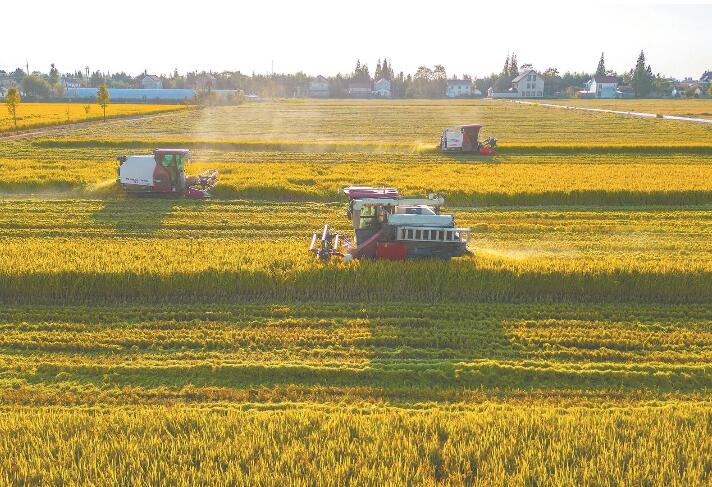 10月30日,在江蘇省海安市開發(fā)區(qū)品建村的洋蠻河高標(biāo)準(zhǔn)農(nóng)田示范區(qū),南通季和智慧農(nóng)業(yè)有限公司的1800多畝水稻收割工作有序進(jìn)行。俯瞰大地,金黃的稻田綿延成片,多臺收割機(jī)穿梭其中。