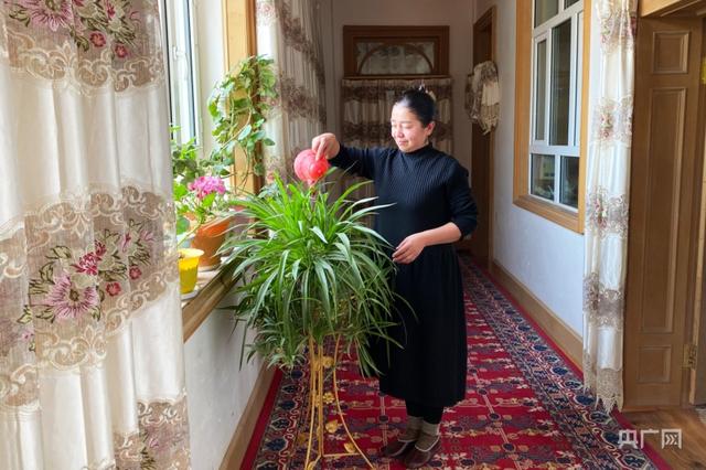 村民卡力比努爾·阿不都許庫正在電暖房中澆花(央廣網(wǎng)發(fā)楊林攝)