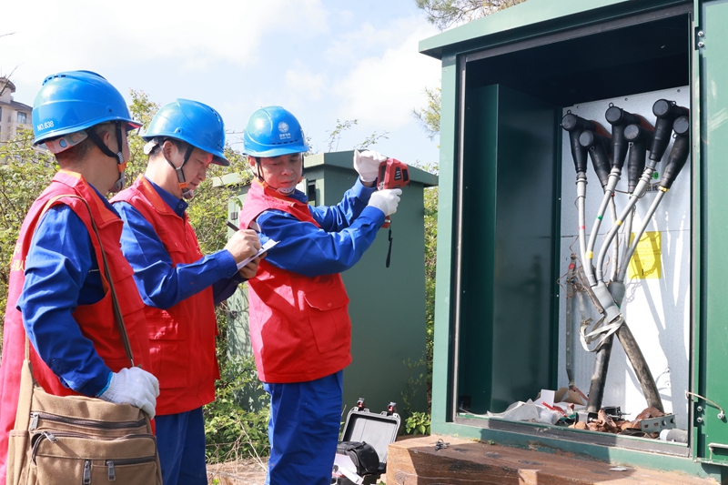工作人員對(duì)10千伏三羅線電纜分支箱進(jìn)行測(cè)溫。(國(guó)網(wǎng)四川省電力公司達(dá)州供電公司 供圖)
