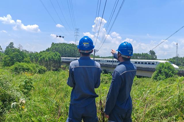 輸電運(yùn)維人員利用無(wú)人機(jī)對(duì)交叉跨越高速鐵路的線路開(kāi)展巡視。賀州供電局供圖