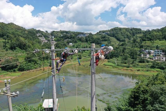 南方電網(wǎng)興仁供電局工作人員對(duì)新田水庫供電線路10千伏龍麻線白墳支線進(jìn)行遷改搭線。