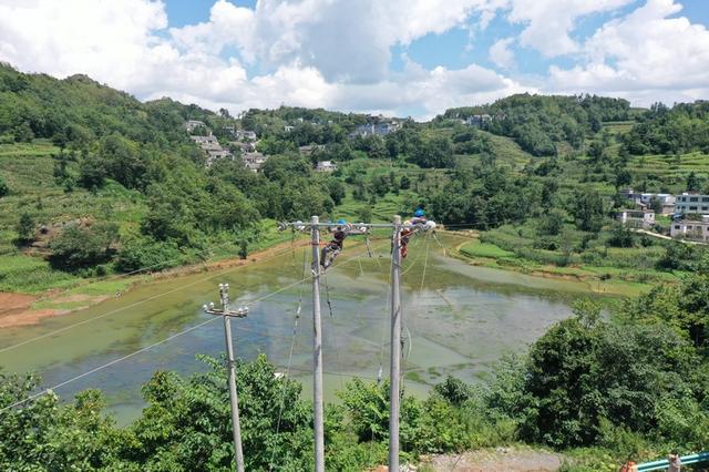 南方電網(wǎng)興仁供電局工作人員對(duì)新田水庫10千伏龍麻線新田支線線纜進(jìn)行緊線操作。