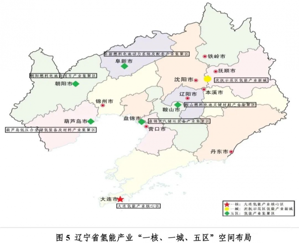 根據(jù)遼寧省現(xiàn)有氫能產(chǎn)業(yè)發(fā)展基礎(chǔ),以“合理集聚、產(chǎn)業(yè)協(xié)同、政企聯(lián)動(dòng)、互為支撐”為原則進(jìn)行空間布局和優(yōu)化,著力構(gòu)建“一核、一城、五區(qū)”的氫能產(chǎn)業(yè)空間發(fā)展格局。