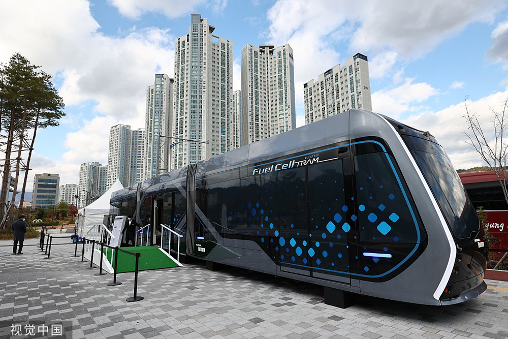 當(dāng)?shù)貢r間2021年11月10日,韓國蔚山,當(dāng)?shù)嘏e行“2021年蔚山國際氫能博覽會暨論壇“(H2WORLD),展出氫燃料電池車輛,并鼓勵氫能源的使用。人民視覺 資料圖