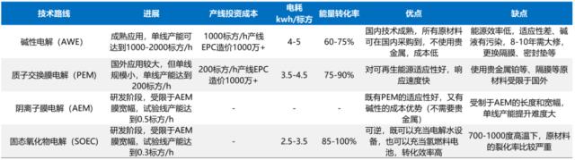 當(dāng)前,綠氫生產(chǎn)技術(shù)主要有堿性電解(ALK)、質(zhì)子交換膜電解(PEM)、陰離子交換膜電解(AEM)以及固體氧化物電解(SOEC)四種。其中堿性制氫技術(shù)成本最低,國(guó)內(nèi)90%項(xiàng)目采用該技術(shù),海外此前以PEM為主,近兩年為降本也逐步轉(zhuǎn)至堿性路線,預(yù)計(jì)未未來(lái)的規(guī)?;惺诫娊馑茪湟詨A性為主。