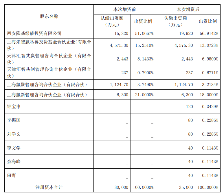 公告顯示,基于對(duì)隆基氫能未來(lái)發(fā)展的信心,根據(jù)經(jīng)營(yíng)需要,公司通過(guò)全資子公司隆基投資向其控股子公司隆基氫能增資4.6億元,其中4600萬(wàn)元增加隆基氫能注冊(cè)資本,4.14億元計(jì)入隆基氫能資本公積;公司董事、高級(jí)管理人員及經(jīng)營(yíng)團(tuán)隊(duì)核心管理人員鐘寶申、李振國(guó)、劉學(xué)文、李文學(xué)、佘海峰、田野六人向隆基氫能增資4000萬(wàn)元,其中400萬(wàn)元增加隆基氫能注冊(cè)資本,3600萬(wàn)元計(jì)入隆基氫能資本公積。本次合計(jì)增資5億元,其中5000萬(wàn)元增加隆基氫能注冊(cè)資本,4.5億元計(jì)入隆基氫能資本公積,本次增資完成后,隆基氫能的注冊(cè)資本將增加至3.5億元。