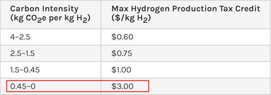 根據(jù)氫氣生產(chǎn)路徑碳強(qiáng)度的不同,稅收抵免激勵(lì)程度也不同,比如如果生產(chǎn)1千克的氫氣只排放0-0.45千克的二氧化碳當(dāng)量,就可以獲得3美元/公斤的最高補(bǔ)貼。并且,綠氫項(xiàng)目還可申請最高30%的投資稅收抵免。