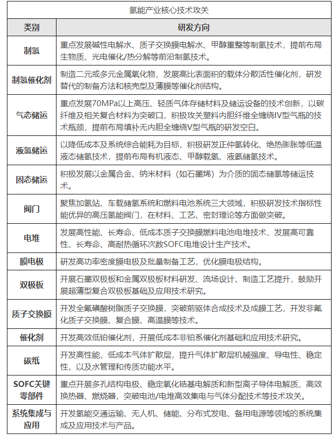 1.加快核心關(guān)鍵技術(shù)研發(fā)。以產(chǎn)業(yè)化為導(dǎo)向,推動核心技術(shù)的關(guān)鍵性能提升與綜合成本降低,實(shí)現(xiàn)核心技術(shù)與產(chǎn)品的自主可控。鼓勵創(chuàng)新多元化制氫工藝方式,重點(diǎn)發(fā)展高效率、長壽命、低成本的質(zhì)子交換膜電解水、甲醇重整等制氫技術(shù),提前布局生物質(zhì)、光電催化/熱分解等前沿制氫技術(shù)。重點(diǎn)發(fā)展70MPa以上高壓、輕質(zhì)氣體存儲材料及儲運(yùn)設(shè)備的技術(shù)創(chuàng)新,提前布局以液態(tài)化合物為介質(zhì)的液態(tài)儲氫和以合金、納米材料為介質(zhì)的固態(tài)儲氫等儲運(yùn)技術(shù)。重點(diǎn)開展高性能和低成本的質(zhì)子交換膜、膜電極、碳紙、催化劑等燃料電池關(guān)鍵材料和核心零部件的技術(shù)創(chuàng)新,實(shí)現(xiàn)燃料電池系統(tǒng)關(guān)鍵性能指標(biāo)達(dá)到國內(nèi)領(lǐng)先水平,綜合成本顯著降低。