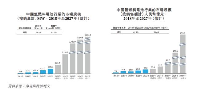 而中國氫燃料電池行業(yè)的市場規(guī)模也已由2018年的人民幣7億元增至2022年的29億元,復合年增長率為41.8%。預計將于2027年達到人民幣293億元。