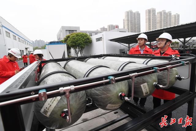 4月12日,中國(guó)石化氫能裝備制造基地在武漢正式揭牌。圖為嘉賓參觀基地生產(chǎn)的氫能裝備。記者周超 攝