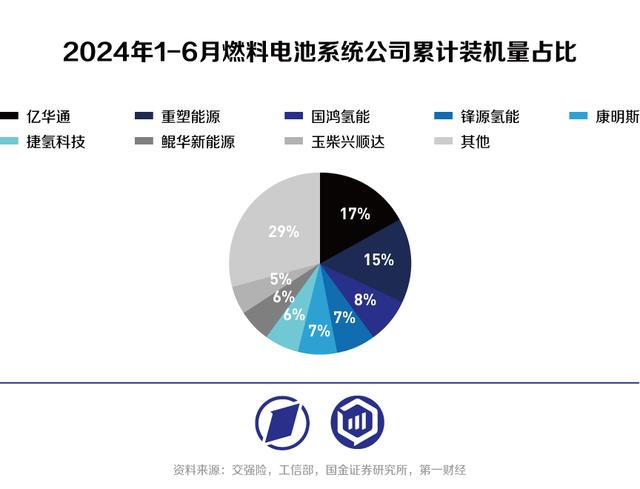 但燃料電池系統(tǒng)供應(yīng)商的競爭格局仍在不斷變化中。2024年1-6月,國內(nèi)燃料電池系統(tǒng)公司累計(jì)裝機(jī)量排名,億華通作為龍頭繼續(xù)保持第一,2-6名分別為重塑能源、國鴻氫能、鋒源氫能、康明斯、捷氫科技,而2023年2-6名分別為捷氫科技、重塑能源、國鴻氫能、濰柴動力、未勢能源。