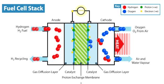 氫燃料電池工作原理是氫氣通過燃料電池正極當(dāng)中的催化劑(鉑)分解成電子和氫離子(質(zhì)子)。其中質(zhì)子通過質(zhì)子交換膜(Proton Exchange Membrane)到達負極和氧氣反應(yīng)變成水和熱量。對應(yīng)的電子則從正極通過外電路流向負極產(chǎn)生電能。