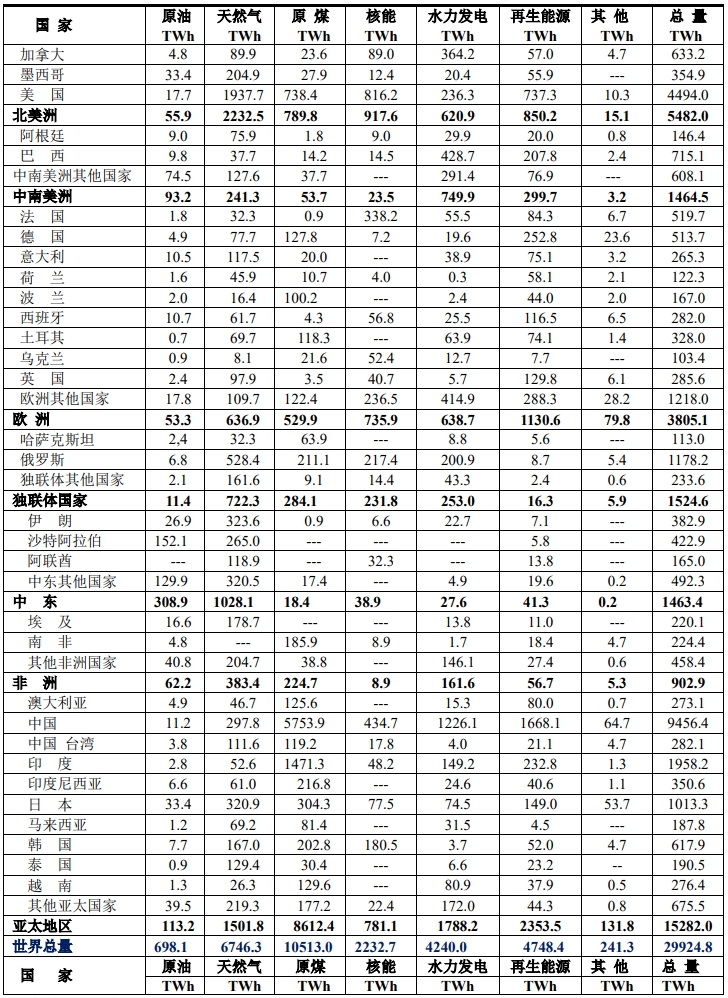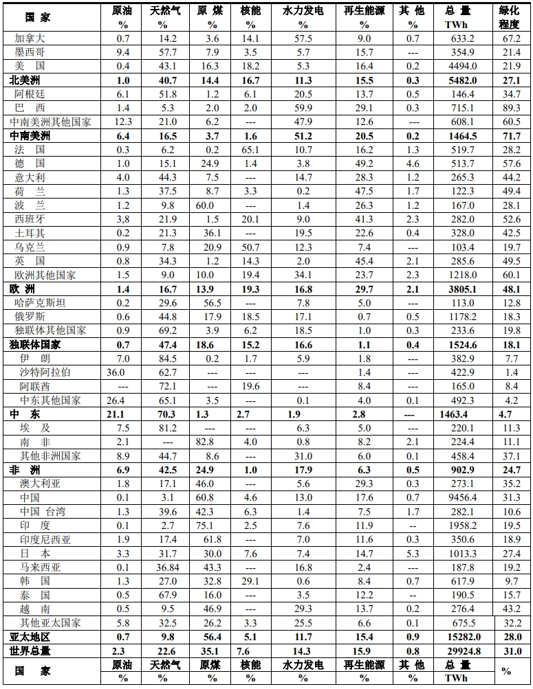表1 2023年世界各國電力結構 (以發(fā)電量TWh表示)