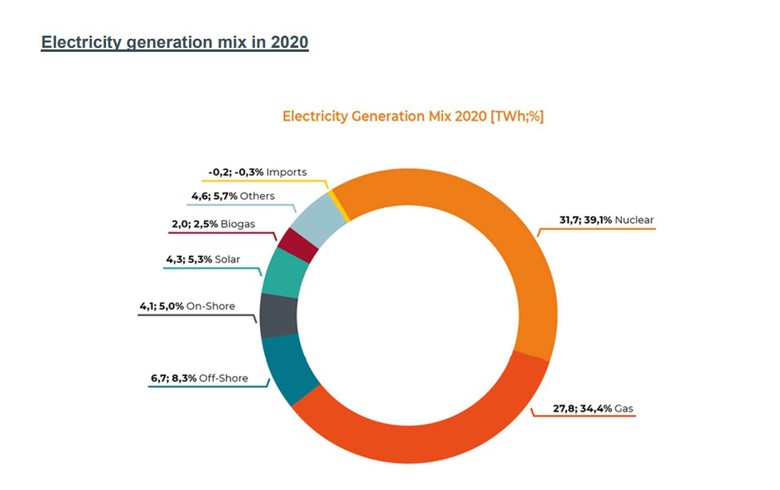 除了擴(kuò)大可再生能源發(fā)電能力外,2020年電力標(biāo)志是核能發(fā)電量下降,滿足了比利時(shí)39.1%的電力需求,燃?xì)獍l(fā)電廠電量趨于穩(wěn)定,以及電力進(jìn)出口之間接近平衡。