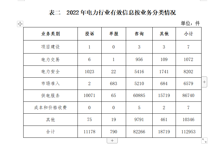 電力行業(yè)排在首位,有效信息數(shù)量為112953件,占全部有效信息的68.82%。群眾關(guān)注的內(nèi)容主要集中在供電服務(wù)、電力安全、市場(chǎng)準(zhǔn)入等方面。(2022年電力行業(yè)有效信息按業(yè)務(wù)分類情況見表二)