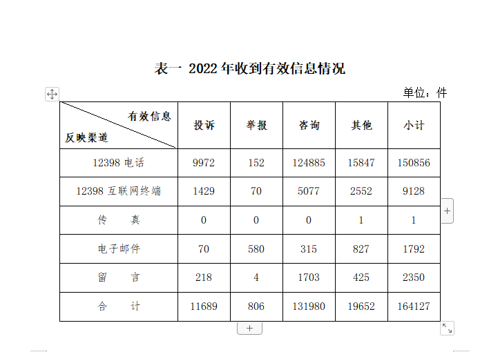 2022年,國(guó)家能源局12398能源監(jiān)管熱線(以下簡(jiǎn)稱12398熱線)共收到有效信息164127件(包含投訴、舉報(bào)、咨詢和其他訴求類別),同比增加25.54%。(2022年收到有效信息情況見表一)
