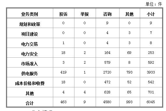 投訴舉報(bào)主要集中在電力行業(yè),共472件。從業(yè)務(wù)分類情況看,電力交易方面1件,占0.21%;電力安全方面20件,占4.24%;市場(chǎng)準(zhǔn)入方面5件,占1.06%;供電服務(wù)方面420件,占88.98%;成本價(jià)格和收費(fèi)方面18件,占3.81%;其他方面8件,占1.69%。(2018年1月電力行業(yè)有效信息按業(yè)務(wù)分類情況見表二)